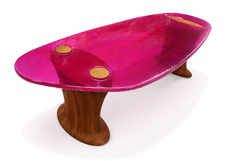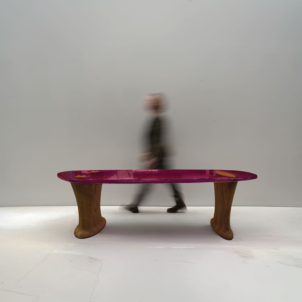 The Candy Crush table stands on monumental legs composed of assembled European oak blocks evoke the quiet strength of elephant limbs.