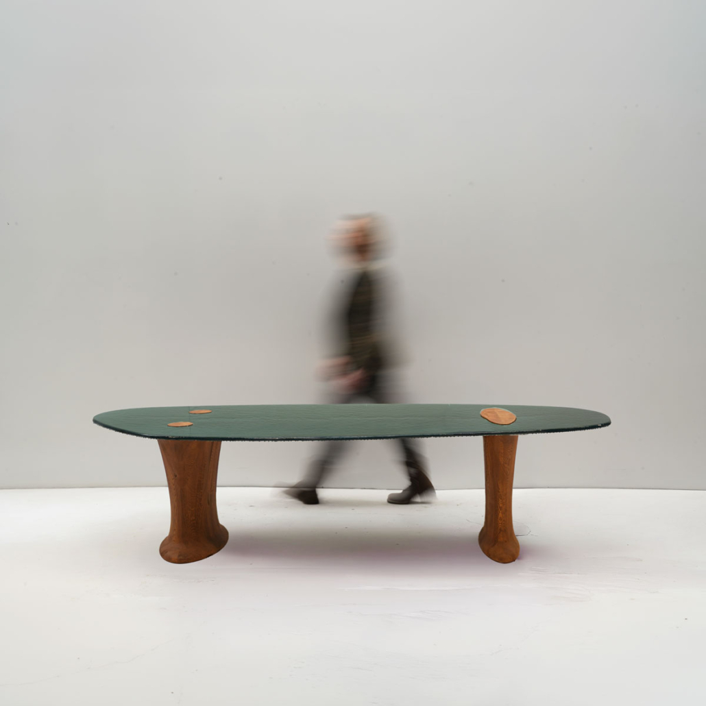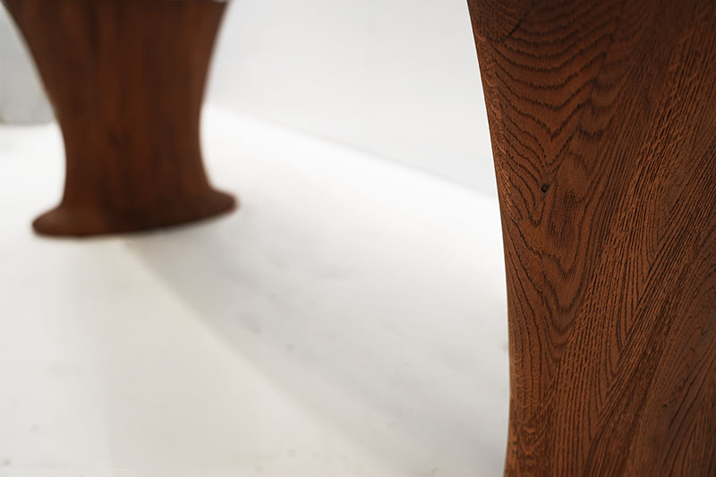 In Forest Green, Hertman highlights the contrast between mass and lightness. Monumental legs composed of assembled European oak blocks evoke the quiet strength of elephant limbs.