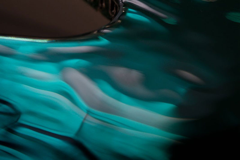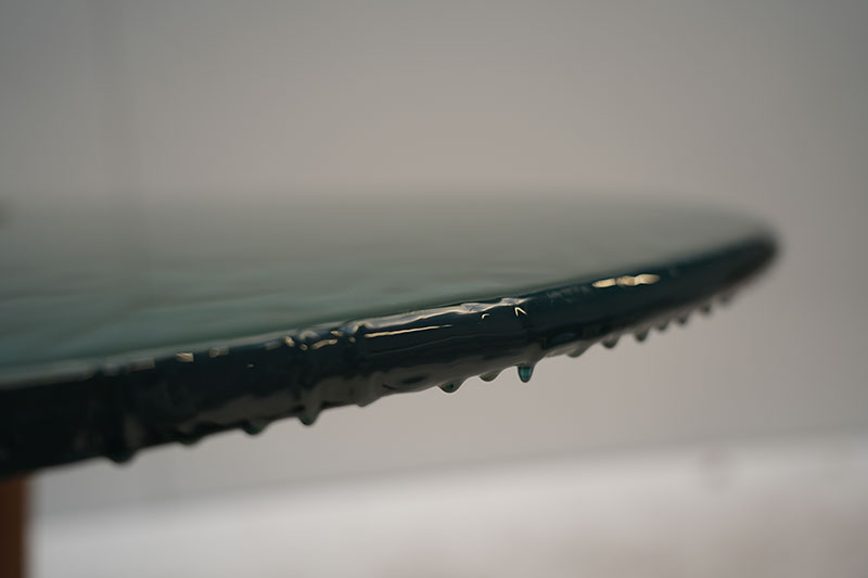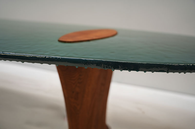 Above them rests an extremely thin tabletop whose fluid, wave-like surface introduces a dreamlike softness, as if shaped by water in motion.